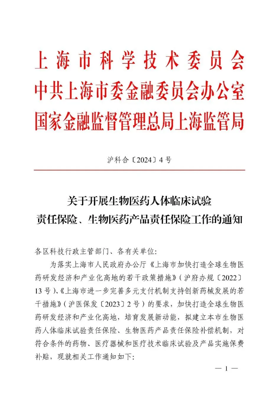 上海市科学技术委员会、中共上海市委金融委员会办公室、国家金融监督管理总局上海监管局发布的《关于开展生物医药人体临床试验责任保险、生物医药产品责任保险工作的通知》(沪科合〔2024〕4号),对注册在上海市符合《通知》要求的对象给予50%的财政补贴,单个保单不超过50万!