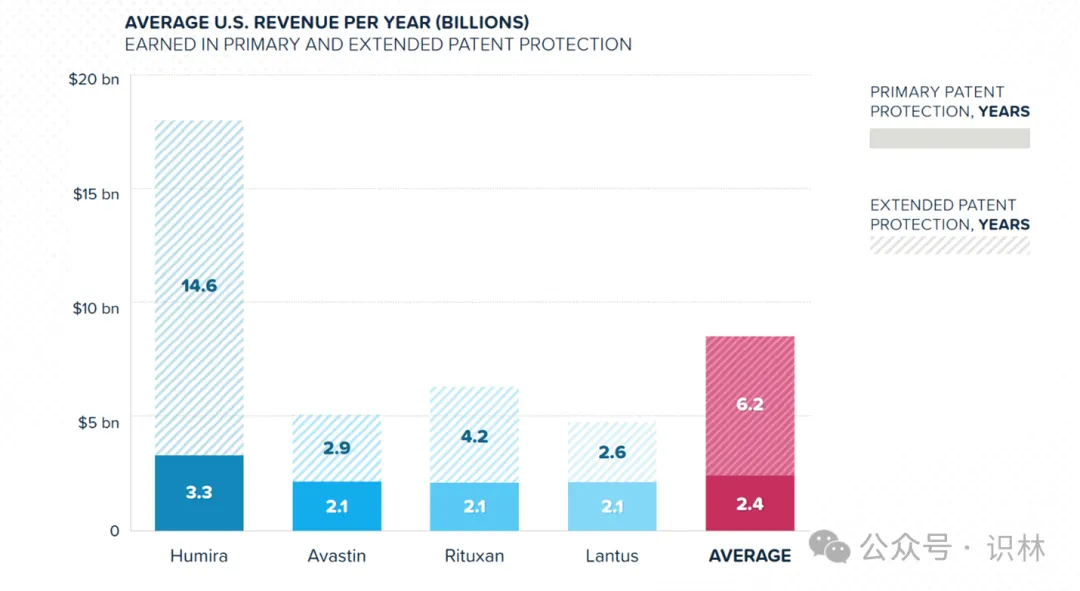 通过查看数据,I-MAK 发现 修美乐、Rituxin、Avastin 和 Lantus 在商业上市后面临首次生物类似药竞争之前平均拥有 19.4 年的市场垄断期,其中包括 13.2 年的剩余主要专利保护,以及额外 6.2 年的扩展专利保护。在主要专利保护到期后,所有 4 种生物药的年收入合计显著增加。这些药品在扩展专利保护期内的平均年销售额为 62 亿美元,而在主要专利保护时期为 24 亿美元,这表明每年延长专利保护期会给系统带来巨大的成本。下图来自 I-MAK 的报告《专利丛林负担》,显示了这一点。