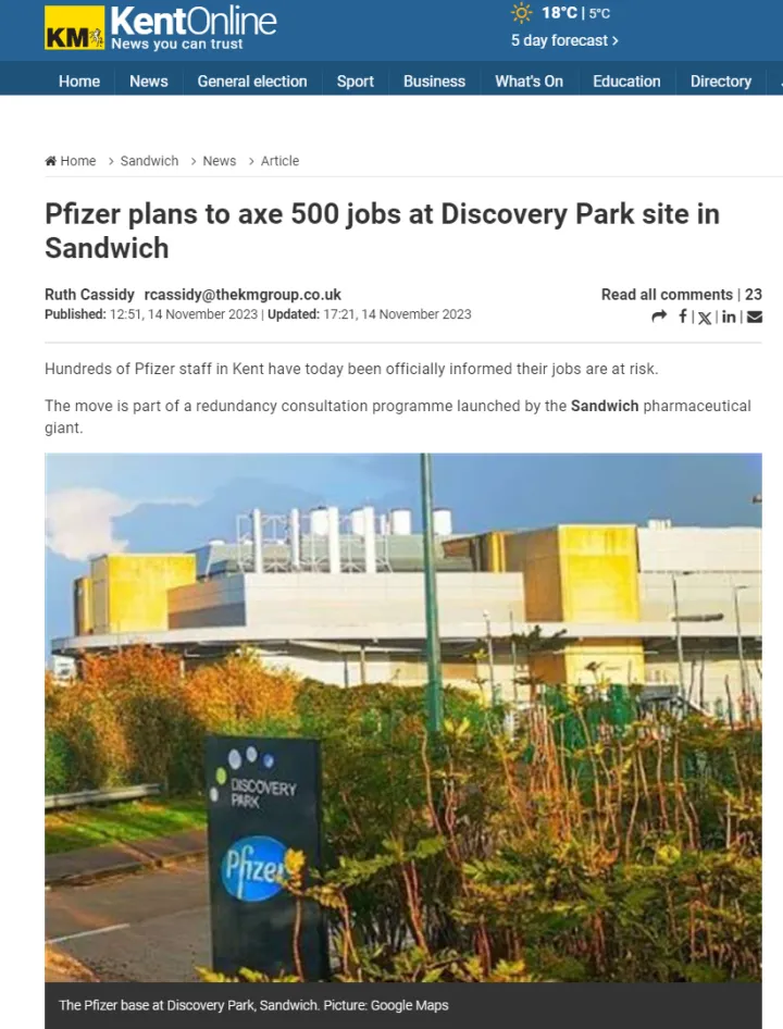 不过,随着辉瑞企业战略的调整,降本增效计划之下,全球成本削减迫在眉睫。2023年11月,作为全球成本削减计划的一部分,辉瑞宣布英国Sandwich工厂裁员500人。裁员主要降低了该厂的小分子生产能力,其他功能将以“不同的规模”继续保留。