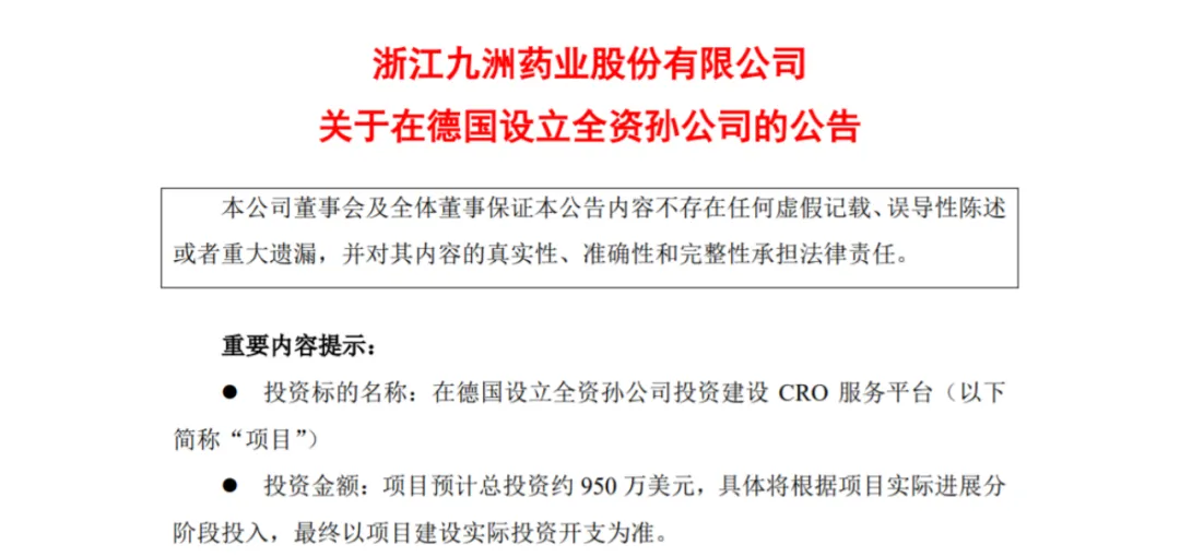 今年5月22日,九洲药业发布公告称,公司拟以自有资金通过新加坡全资子公司Raybowlifesciences(Singapore)PTE.LTD在德国设立全资孙公司建设CRO服务平台,主要从事创新药CRO服务,项目预计总投资约950万美元。