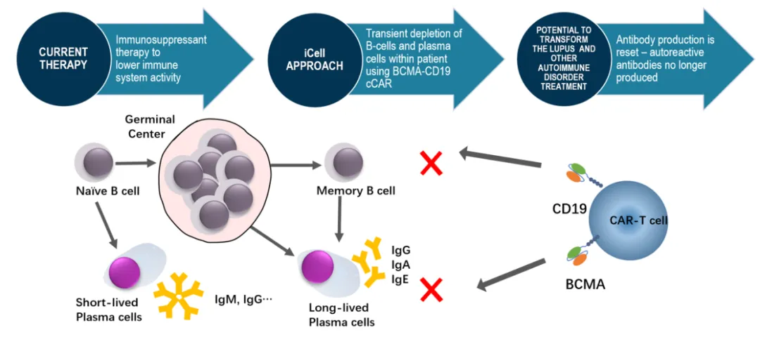 生物医药公司iCell Gene Therapeutics开发了一种新型的BCMA-CD19复合CAR-T疗法(cCAR-T),旨在同时靶向浆细胞抗原BCMA和记忆B细胞抗原CD19,以实现患者B细胞的全面耗竭,进而达到免疫重置、症状缓解和疾病无药物缓解(MFR)。
