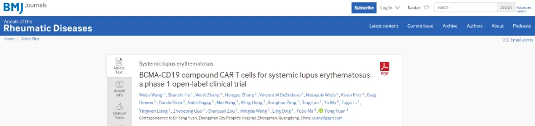 cCAR-T治疗SLE的Ⅰ期临床数据发表权威期刊