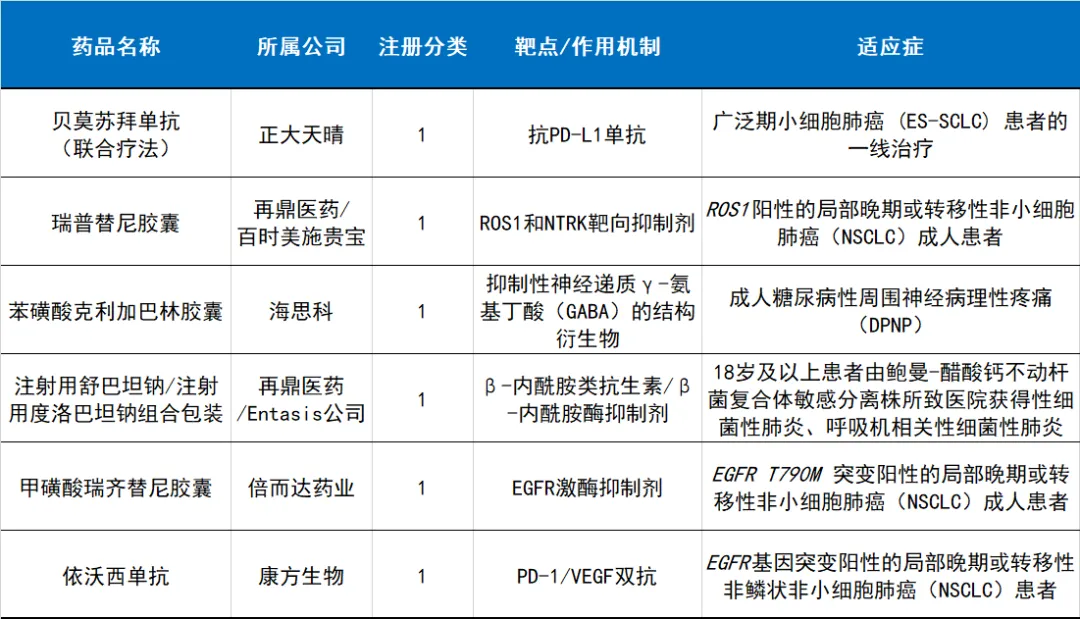 在癌症领域之外,还有2款1类新药获批,分别是海思科药业的苯磺酸克利加巴林胶囊获批治疗“糖痛”,以及再鼎医药引进的注射用舒巴坦钠/注射用度洛巴坦钠获批用于治疗特定的细菌性肺炎。具体如下图:
