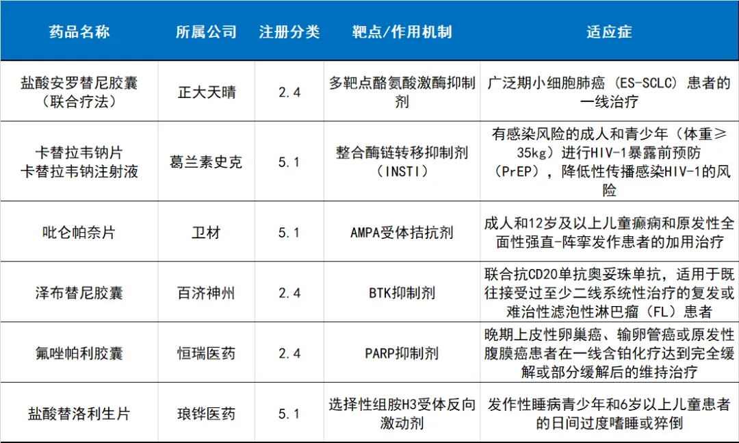 在新适应症方面,本月百济神州的BTK抑制剂泽布替尼胶囊、恒瑞医药的PARP抑制剂氟唑帕利胶囊、正大天晴的安罗替尼胶囊、葛兰素史克的HIV治疗药物卡替拉韦钠注射液、卫材的AMPA受体拮抗剂吡仑帕奈片,以及琅铧医药的盐酸替洛利生片均有新斩获,获批的适应症涉及癌症、艾滋病(HIV)以及癫痫、发作性睡病等疾病。