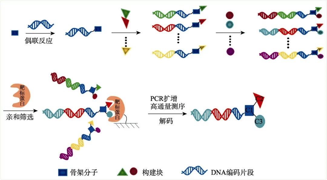 DEL技术对应的各个环节,主要有1)DNA编码化合物库的构建;2)基于库进行的亲和筛选工作;3)筛选结果的解码与解析;4)定向合成与再验证。