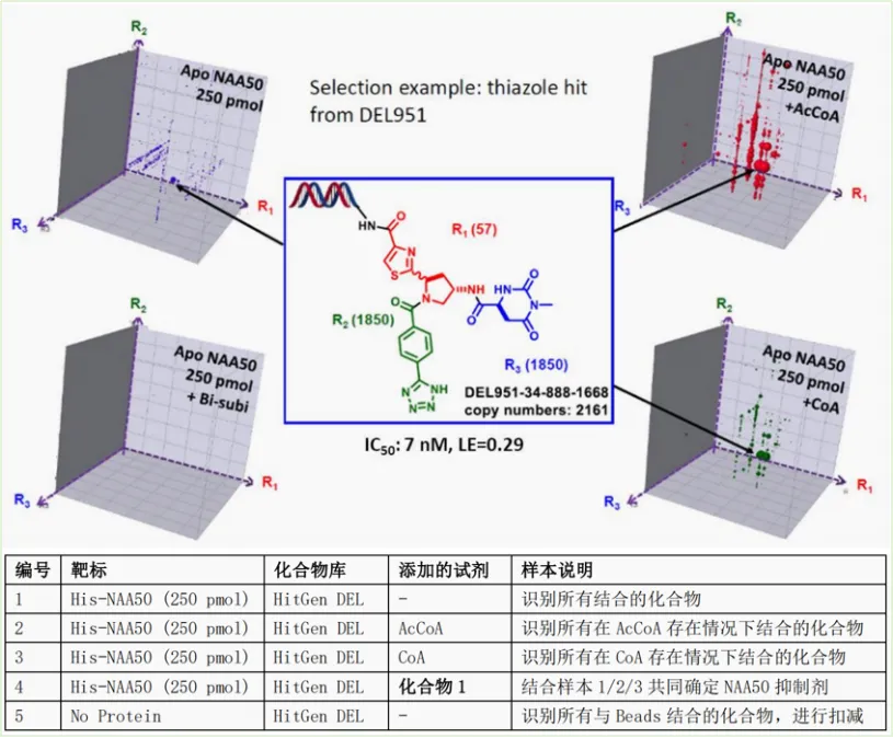 目前,公司有多个内部新药项目处于临床及临床前不同阶段。官网公开了一些项目案例,如与美国辉瑞合作项目“通过DNA编码化合物库筛选发现新颖高活性NAA50抑制剂”,该项目在典型的DEL选择方案中,设置了3个样本(靶标本身,本案例为His标签的NAA50蛋白;His标签的NAA50蛋白加上饱和浓度下的抑制剂化合物1;空白对照),研究中发现NAA50蛋白在催化过程中涉及构象的变化,因此又添加了AcCoA和CoA另外两个样品,寻找与过渡态结合的化合物。最后的筛选实验设计及结果见下图。