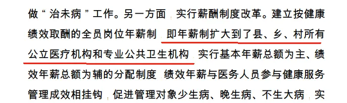 值得注意的是,这里的基本年薪,是不包括绩效年薪的。公立医疗机构的绩效总额,在医疗服务收入的10%的基础上,根据考核情况上下浮动。对于村卫生室的村医来说,年薪10万,在多数地区应该算得上高薪酬了,由于药品零差价,很多地方的乡村医生,诊疗收入很少。大部分村医的收入来源,主要通过提供公卫服务而获得的经费补偿,但是由于辖区内常住人口少,公卫经费补助数额有限,综合年收入难以获得提升。那么,在年薪制之下,乡村医生的收入待遇能够得到稳定保障,同时,在医疗资源分配上,也将更加公平。事实上,关于年薪制的推广,去年10月,国家卫健委就在发布会中进行强调。提出实施薪酬制度改革,探索年薪制。不断地提高医务人员的收入水平,为医务人员提供更加可预测和稳定的薪酬结构。从国家和政府的态度上来看,乡村医生的薪酬制度改革越来越趋于完善,如果真的能够将年薪制在全国范围内推广开来,那将在很大程度上解决村医待遇低、发展不平衡的问题,也是百万村医所喜闻乐见的。