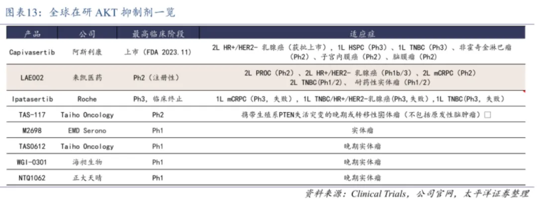 从全球研发格局审视,AKT抑制剂研发是极具潜力而不拥挤的蓝海赛道,目前只有阿斯利康的Capivasertib获批上市,而来凯医药的LAE002(Afuresertib)进度全球第二,中美两地已进入临床三期,两大领军企业进度远远甩开其他公司,中短期内是“绝代双骄”的竞争格局。