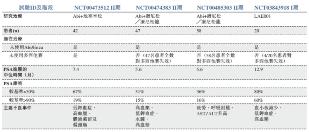 在LAE001已披露的治疗mCRPC一期临床数据显示,在20名可评估的患者中,80%患者PSA应答下降超过50%、60%患者PSA应答下降超过 90%,其初步数据远胜于阿比特龙与地塞米松或泼尼松龙的组合疗法。