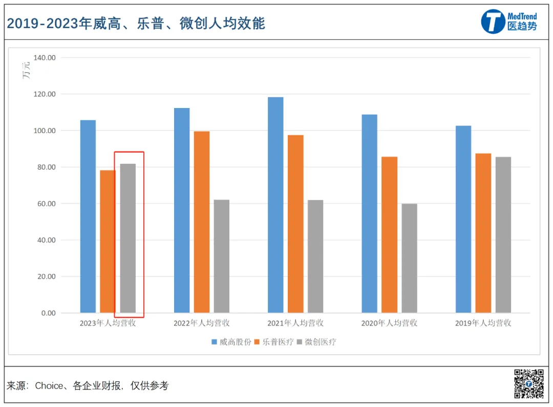 纵观中国高耗三巨头(威高、乐普、微创)近五年人均效能,微创医疗确实长期位居第三。