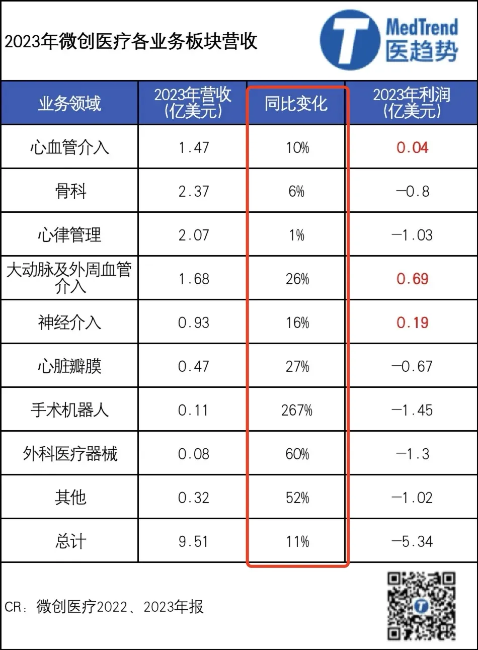 从2023年业绩来看,微创医疗三大核心业务板块——心血管介入(冠脉)、骨科、心律管理营收增速一般;且仅有心血管介入实现盈利。