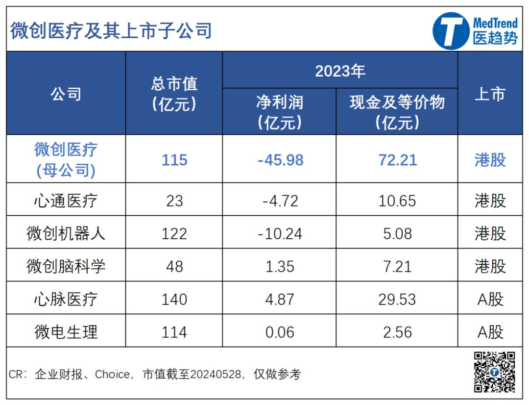 截至2023年,微创医疗业务已覆盖12个细分赛道(产业集群),拥有50多家子公司。其中: