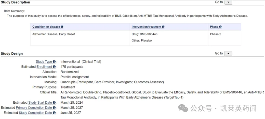 2023年1月31日,Prothena公布了其在研Tau蛋白抗体疗法PRX005在健康受试者中的1期单剂量递增研究结果。此次公布的数据显示,健康受试者血浆中的PRX005浓度与剂量成正比,并具有强大的中枢神经系统(CNS)渗透性。三个剂量队列中,PRX005的安全性和耐受性良好,达到了试验的主要终点。在健康受试者和AD患者中进行的1期多剂量递增试验正在进行中。今年年初,BMS在clinical trails网站上,登记了一款创新Tau抗体药物BMS-986446,在早期阿尔兹海默症中进行与安慰剂对比的二期临床试验。该临床预计将从2024年2月开始,计划入组人数475人。