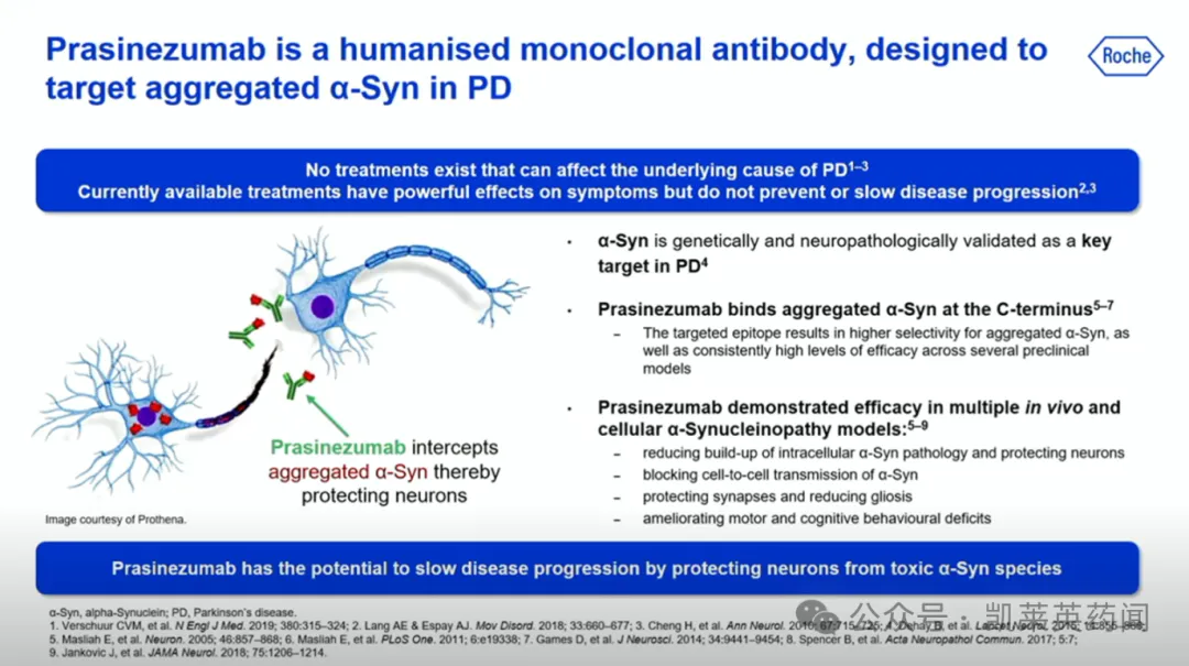 Prasinezumab(PRX002)是一种靶向α-突触核蛋白(α-Syn)的人源化IgG 1 单克隆抗体,旨在靶向聚集形式的 α-Syn的 C 端,从而清除聚集的α-Syn,并有助于减少新聚集体的形成,防止从一个神经元传递到下一个神经元,并减缓或减少神经退行性病变。