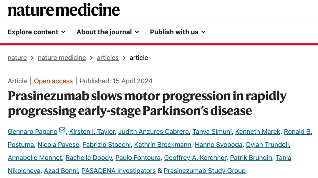 临床前研究使用了多种体内和体外α-突触核蛋白病模型,证明该产品的鼠同源物(9E4)能够阻断α-Syn的细胞间传递,减少细胞内α-Syn病理形成,防止突触丢失和神经胶质增生,并改善认知和运动行为缺陷。2013年12月,Roche与Prothena基于Prasinezumab达成了总金额高达6亿美元的合作开发协议,在2021年的时候,Prothena收到了罗氏支付的6000万美元临床里程碑付款。2024年4月15日,罗氏公司的研究人员在 Nature Medicine 期刊发表了题为:Prasinezumab slows motor progression inrapidly progressing early-stage Parkinson’sdisease 的研究论文,探讨了Prasinezumab这种单克隆抗体在早期帕金森病中的潜在的治疗作用,尤其是在PASADENA第二阶段临床试验中对于快速进展的病例显示出对运动症状进展有一定的减缓效果。