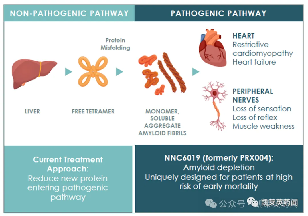 NNC6019是一种研究性人源化单克隆抗体,通过消除与遗传性和野生型ATTR淀粉样变性(hATTR和wtATTR)疾病病理相关的淀粉样蛋白,而不影响蛋白质的天然、正常四聚体形式。NNC6019的作用机制可能是消耗沉积的淀粉样蛋白,以改善器官功能和循环非天然四聚体形式(TTR),以防止进一步的器官沉积。临床前研究显示,PRX004显示出抑制淀粉样纤维形成,结合非天然TTR的可溶性聚集体形式,以及通过抗体介导的吞噬作用,促进不溶性淀粉样纤维清除的能力。