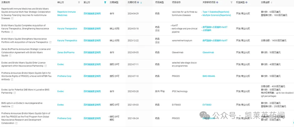 BMS近三年在CNS领域的交易(来源:insight数据库)