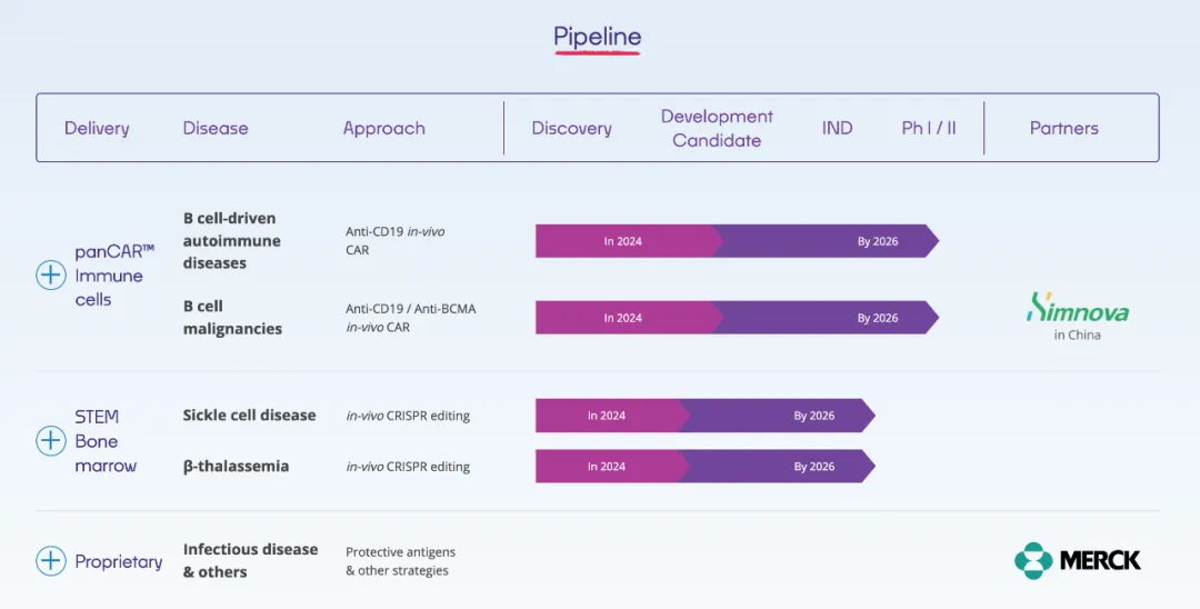 目前,Orna 的研发管线分为三类,分别是体内 CAR 疗法、体内基因编辑疗法和传染病疫苗。