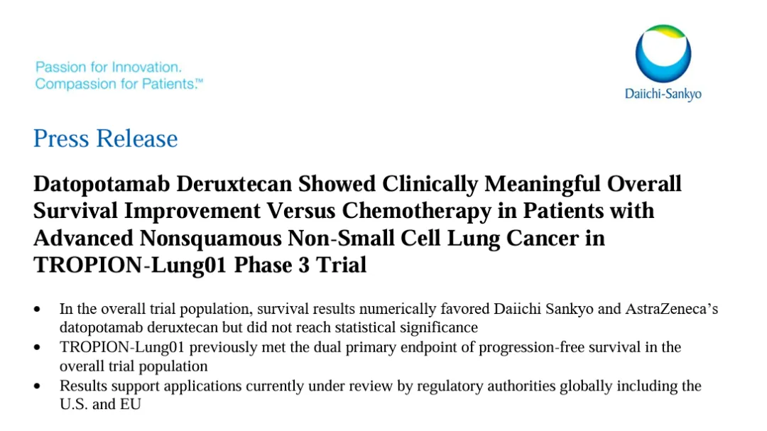 在TROPION-Lung01 3期试验中,与化疗相比,Dato-DXd对晚期非鳞癌非小细胞肺癌患者的总生存期有临床意义的改善,结果在数值上有利,但未达到统计学意义