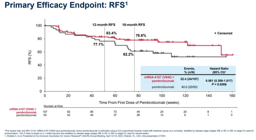 比如mRNA疫苗与PD-1的联用,就是如此。在临床试验中,这一组合已经展示出了潜力。在ASCO年会当中,默沙东与Moderna公布了mRNA-4157与K药联合,在157位经手术切除高风险黑色素瘤患者中的疗效与安全性数据。
