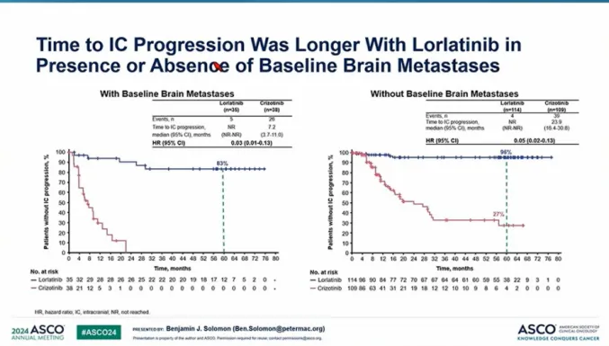 而此次随访5年后,显示无论基线是否存在脑转移,洛拉替尼均能延长颅内无进展时间。具体来说,基线有脑转移的患者中,洛拉替尼组83%在5年内未发生颅内进展,克唑替尼组全部在2年内出现颅内进展,洛拉替尼降低了97%的颅内进展风险;
