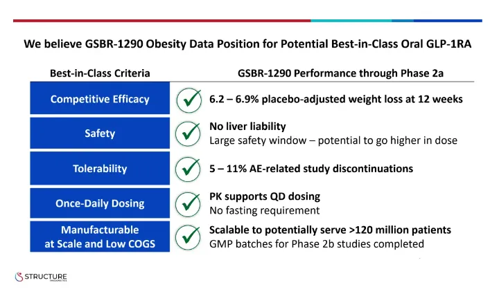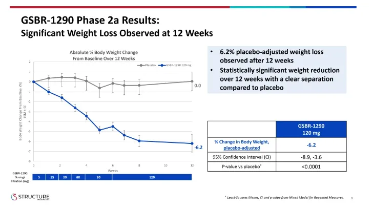 在2a期肥胖研究中,GSBR-1290显示出具有临床意义和统计学意义的安慰剂调整后体重平均减轻6.2%(p<0.0001)。在第 12 周,67% 的 GSBR-1290 治疗参与者实现了 ≥6% 的体重减轻,33% 的体重减轻≥ 10%,而安慰剂组为 0%。