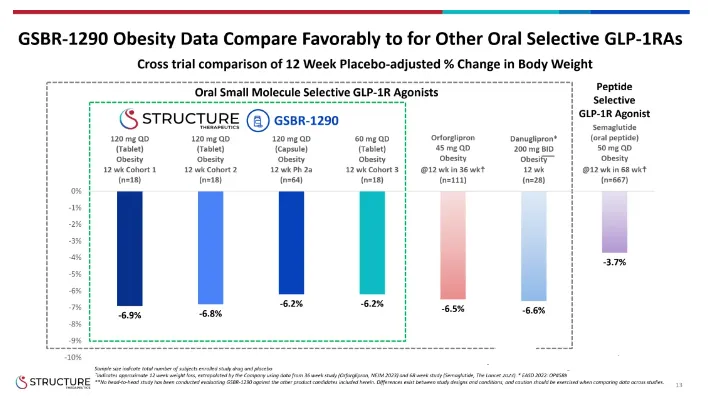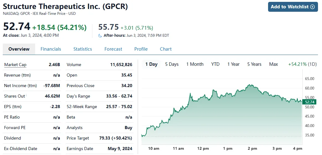基于该研究结果,Structure Therapeutics计划于今年Q4启动为期36周的IIb期肥胖研究,入组约300例受试者,并且使用GSBR-1290片剂配方。而受此消息影响,Structure Therapeutics股价上涨近55%。