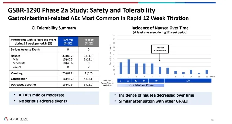 GSBR - 1290在重复给药120mg后,总体表现出良好的安全性和耐受性。正如GLP1 - RA药物类别所预期的那样,主要不良事件( AEs )与胃肠道( GI )相关,最常见的两种AEs是恶心和呕吐。GI相关的不良事件一般在治疗早期被观察到,并在滴定完成后减弱。与AE相关的研究中止率从2a期肥胖研究中的5 %到胶囊至片剂PK研究中的11 %。2项研究均未报告药物性肝损伤或持续性肝酶升高病例。