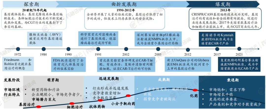 从CGT自身的发展历程来看,它经历了探索期、曲折发展期和爆发期,但是跟化药和大分子小分子靶向药相比,它仍处于萌芽期。