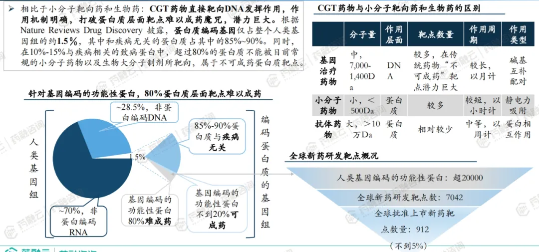 相比于小分子靶向药和生物药,CGT药物直接靶向DNA发挥作用,作用机制明确,打破蛋白质层面靶点难以成药魔咒,潜力巨大。根据Nature Reviews Drug Discovery 披露,蛋白质编码基因仅占整个人类基因组的约1.5%,其中和疾病无关的蛋白质占其中的85%~90%。同时,在10%-15%与疾病相关的致病蛋白中,超过80%的蛋白质不能被目前常规的小分子药物以及生物大分子制剂所靶向,属于不可成药蛋白质靶点。