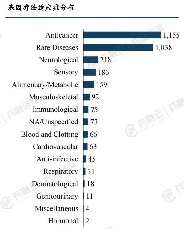 基因疗法适应症分布:肿瘤和罕见疾病是首要领域,自2022年Q1以来,抗癌疗法超过罕见疾病疗法,成为临床最常见治疗类型。