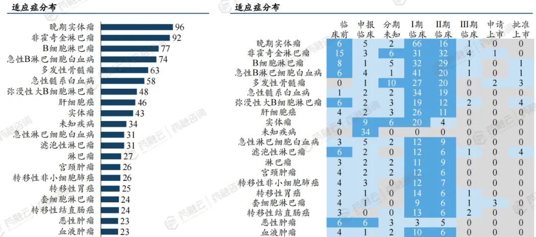 应用技术最普遍的为CAR-T、干细胞治疗、T细胞疗法等研究最集中的靶点依次为CD19、BCMA、CD22聚焦最多的适应症依次为非霍奇金淋巴瘤、晚期实体瘤、急性B淋巴细胞白血病、多发性骨髓瘤、B细胞淋巴瘤。