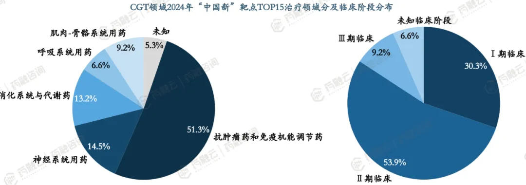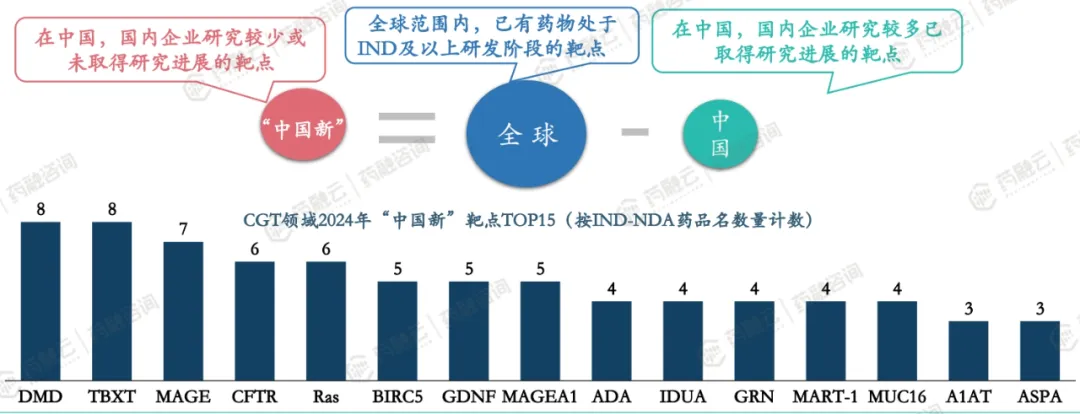 CGT领域2024年“中国新”靶点TOP15。用全球药物研发IND及以上的靶点除去中国药物IND及以上的靶点,得到 “中国新”靶点。靶点在全球范围内已经有药物处于IND及以上研发阶段,即在成药性上获得了一定的验证;排除国内在IND及以上药物涉及靶点,即国内还没有该靶点的药物处于IND及以上阶段。