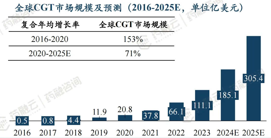 2016-2020年,全球CGT市场规模年复合增长率达153.3%,2020年为20.75亿美元。预计到2025年,市场规模有望达到305.39亿美元。