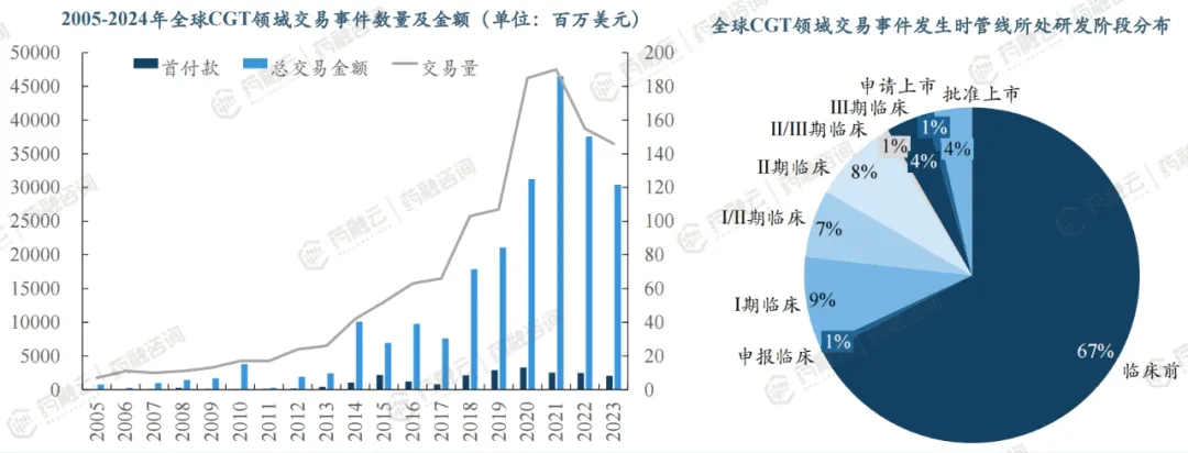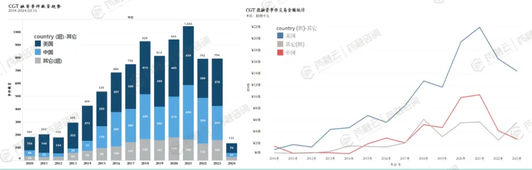 从全球CGT领域交易事件趋势来看,CGT领域交易事件在2020-2022年活跃度较高,交易事件量最高,涉及金额最大。