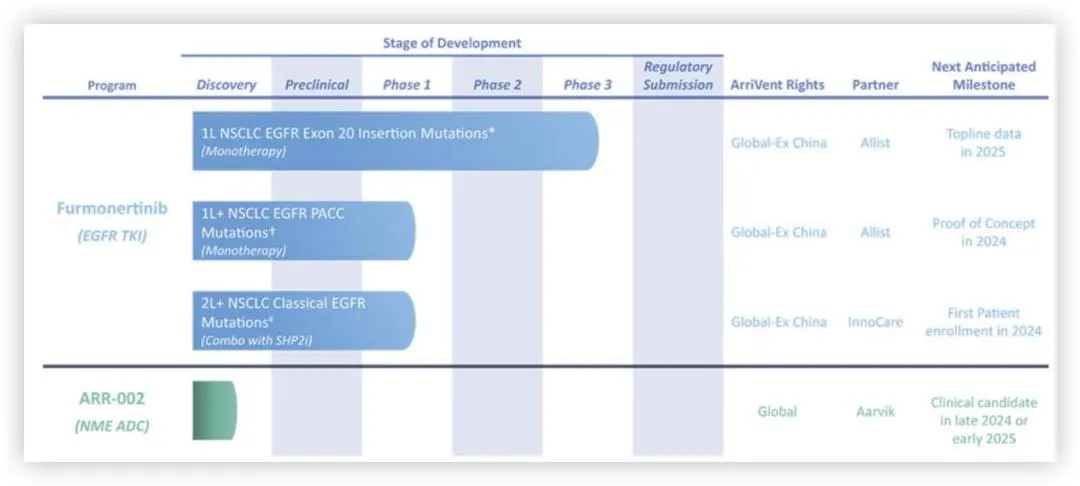 目前,ArriVent有两条管线,一条为伏美替尼(Furmonertinib),也是ArriVent的主要候选药物。一种正处于研究阶段的新型表皮生长因子受体(EGFR)突变选择性酪氨酸激酶抑制剂(TKI),该公司正在开发用于非小细胞肺癌(NSCLC)的EGFR突变(EGFRm),比目前所批准的EGFR TKIs更广泛。Furmonertinib目前正在多个临床试验中进行评估,其中包括一项针对局部晚期或转移性EGFRm NSCLC外显子20插入突变的一线患者的关键3期试验,ArriVent预计该重要试验将在2025年获得顶线数据。