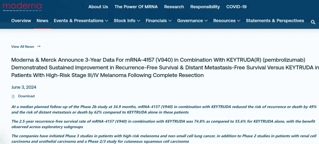 近日,Moderna公布了其mRNA癌症疫苗mRNA-4157(V940)联合默沙东PD-1抑制剂Keytruda用于经手术切除高风险黑色素瘤患者的2b期试验结果。