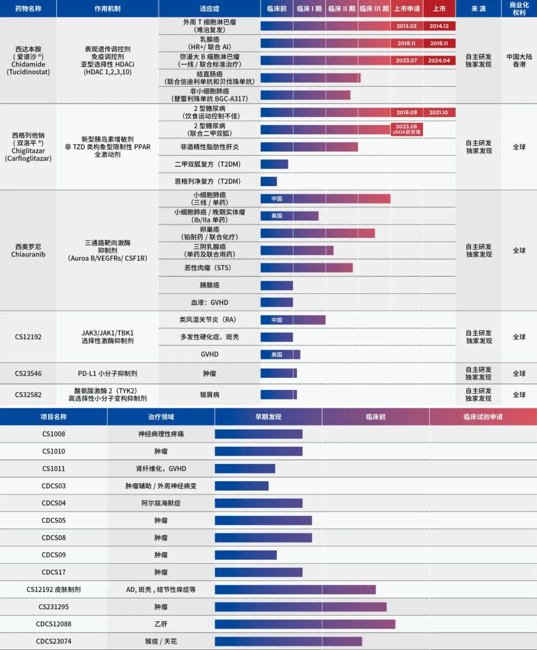 目前,微芯生物共有6款产品如西达本胺、西格列他钠、西奥罗尼、CS12192、CS23546、CS32582等处于临床阶段,其适应症包括肿瘤、非酒精性脂肪肝炎、类风湿关节炎、斑秃、银屑病等。另有13款差异化优势产品在临床前阶段,治疗领域包括肿瘤、神经性病理性疼痛、胃纤维化、阿兹海默症、斑秃、乙肝、猴痘/天花等。