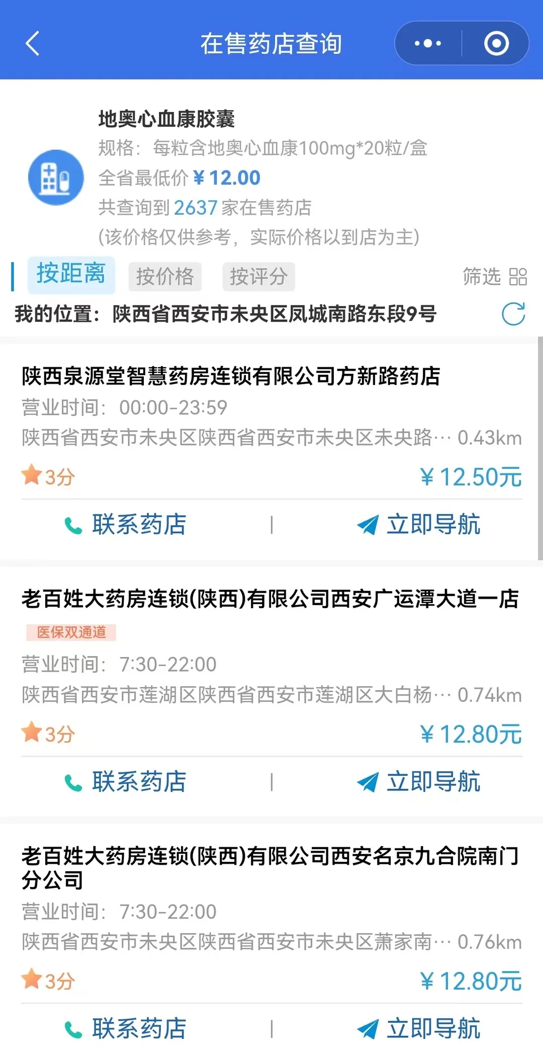 一是药品比价更全面。输入药品名称可查询到相同药品的所有生产厂家、所有规格在全省定点零售药店的实际销售价格,并可按距离、价格或评分筛选及展示相关药店。