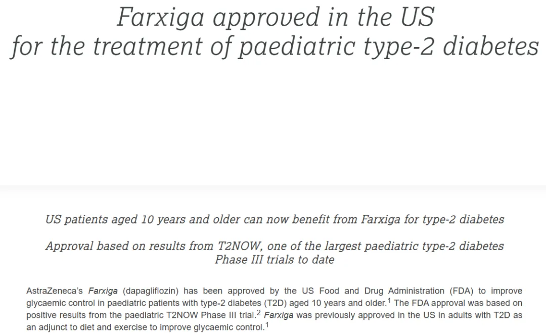 6月12日,阿斯利康的Farxiga(达格列净)获美国FDA批准,用于改善10岁及以上2型糖尿病(T2D)患儿的血糖控制。Farxiga此前在美国被批准用于成人患者,作为饮食和运动的辅助药物,以改善血糖控制。