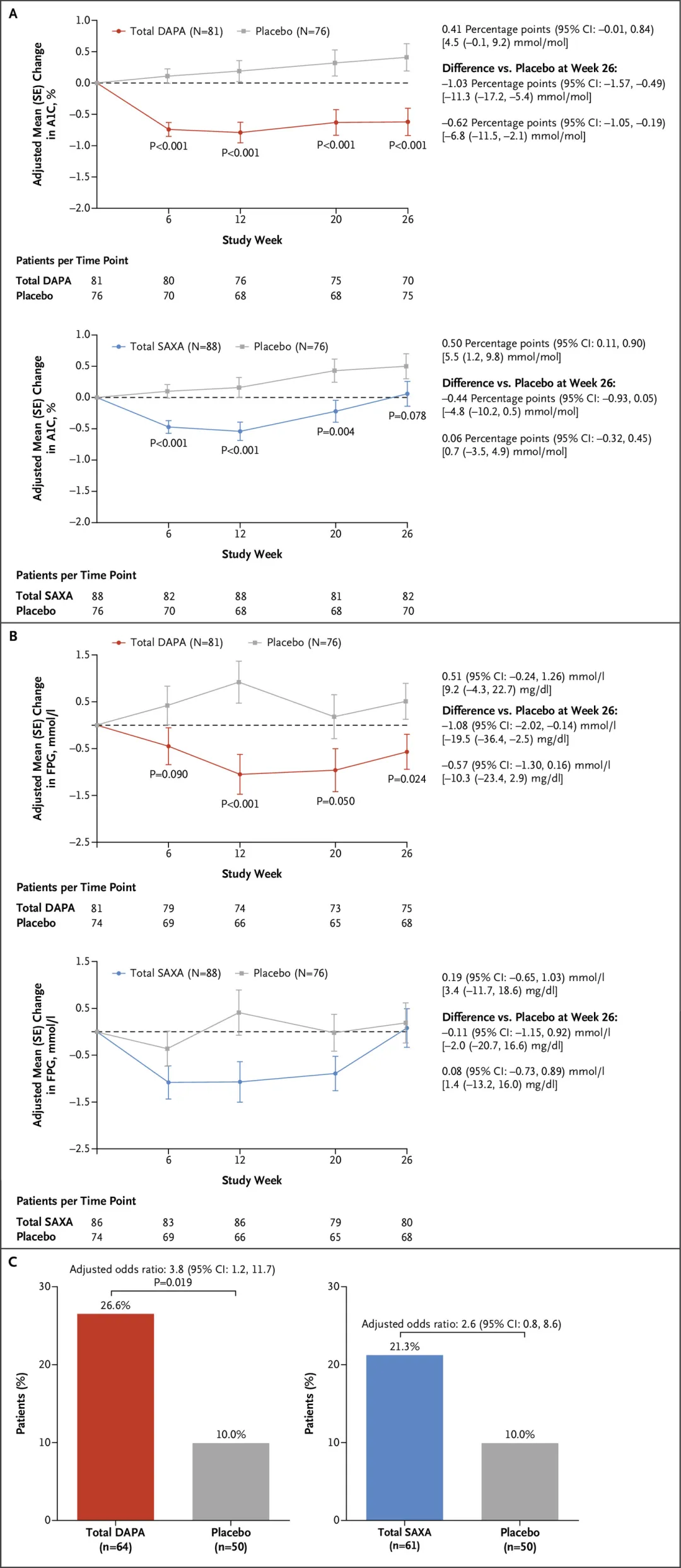 FDA的批准是基于III期T2NOW试验的阳性结果,T2NOW研究是一项为期26周的随机、双盲、多中心III期临床,旨在评估在接受二甲双胍、胰岛素或两者并用治疗的儿童和青少年2型糖尿病患者中,达格列净作为附加治疗的有效性和安全性。研究共纳入245名患者,随机分配接受5mg达格列净(n=81)、2.5mg沙格列汀(saxagliptin,n=88)和安慰剂(n=76)治疗。第12周时,达格列净和沙格列汀组中HbA1c≥7%的患者进一步按照1:1的比例随机分配,以继续给药或增加至更高剂量(10mg达格列净或5mg沙格列汀)。主要终点是第26周HbA1c的变化,次要终点包括空腹血糖(FPG)的变化和26周后HbA1c<7.0% (53mmol/mol)的患者比例。安全性评估超过52周。结果显示,主要终点方面,第26周时达格列净组患者的HbA1c调整后平均降低0.62%,安慰剂组增加0.41%,二者差值为1.03%;沙格列汀组患者的HbA1c调整后平均增加0.06%,安慰剂组增加0.5%,二者差值为0.44%。其它次要终点也均得到统计学意义的改善。