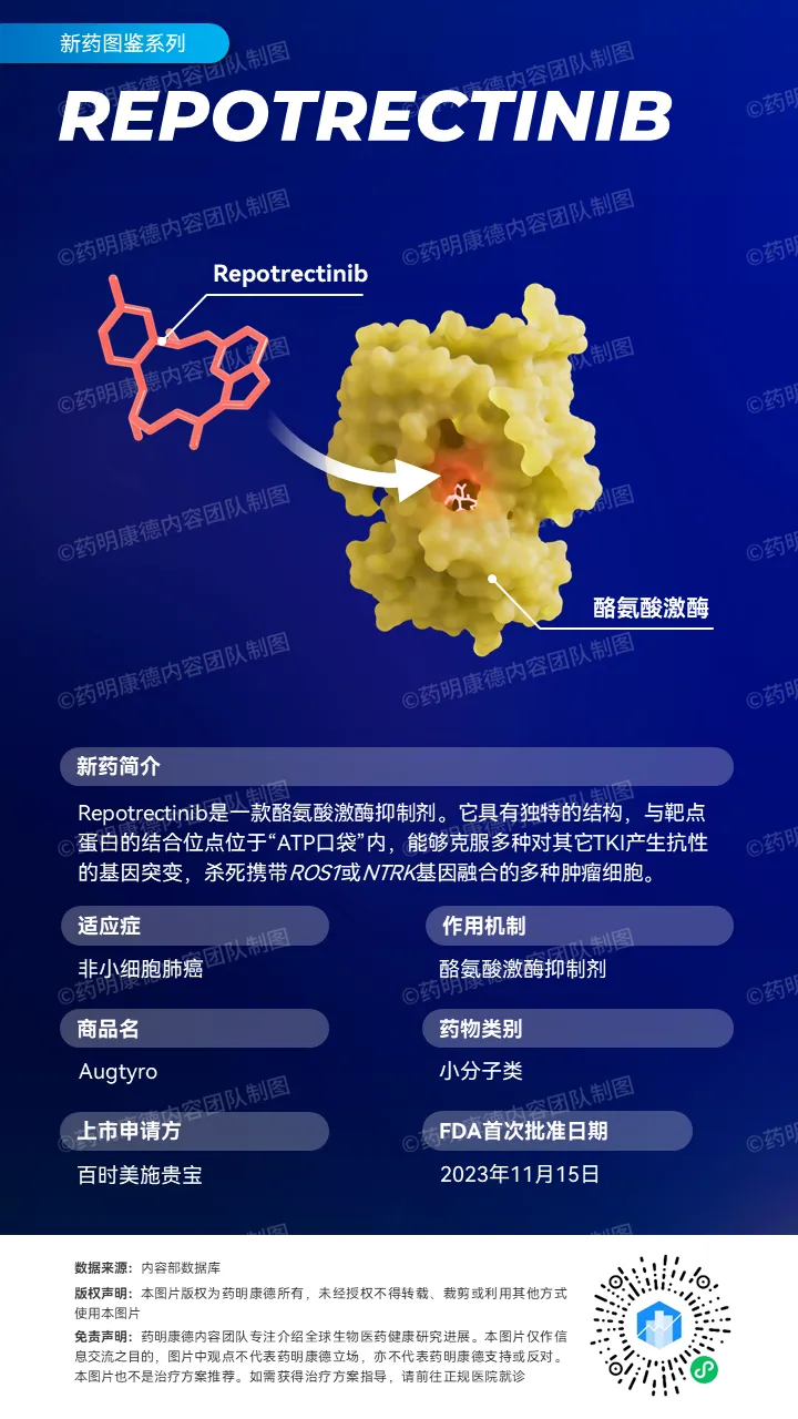 Augtyro是Turning Point公司(现已被百时美施贵宝收购)开发的一款ROS1和NTRK靶向抑制剂。它具有独特的结构,与靶点蛋白的结合位点位于“ATP口袋”内,并且不受多种耐药性突变的影响。因此,它能够克服多种对其它TKI产生抗性的基因突变,杀死携带ROS1或NTRK基因融合的多种肿瘤细胞。该疗法于2023年11月获FDA批准用于局部晚期或转移性ROS1阳性非小细胞肺癌(NSCLC)成人患者的治疗。根据新闻稿,Augtyro是首款获批用于ROS1阳性NSCLC患者的新一代TKI疗法。
