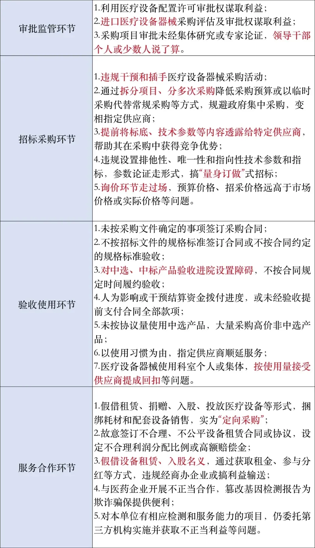 中纪委发布的《青岛紧盯医疗领域突出问题 贯通力量破解就医难》一文中披露,青岛市纪委监委督促主责部门统筹财务审计、招标采购、医保稽核等专门力量30余人参与监督,形成问题清单24份,并指导驻在单位内设纪检机构开展监督检查86次,发现并推动整改问题102个。各类医疗反腐相关的重磅文件与行动也接踵而至。5月27日,国家十四部委联合发布《关于印发2024年纠正医药购销领域和医疗服务中不正之风工作要点的通知》(简称《通知》),明确提出加大医药购销领域商业贿赂治理力度,紧盯项目招采、目录编制、价格确定、项目申请、新药申报、回款结算等权力集中、资金密集、资源富集的医药领域风险,聚焦虚开发票、虚假交易、虚设活动等形式违规套取资金用于实施不法行为,保持打击高压态势。