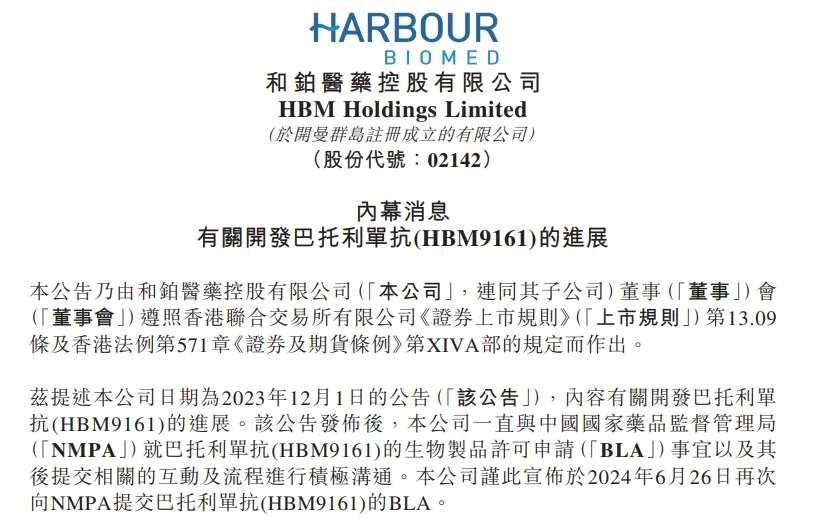6月27日,和铂医药宣布,已向国家药品监督管理局(NMPA)重新递交公司在研药物巴托利单抗(HBM9161)治疗全身型重症肌无力(gMG)的生物制品许可申请(BLA)。