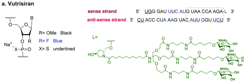 Vutrisiran的化学结构此外,vutrisiran 对所有关键亚组的主要综合终点和所有次要终点均表现出一致的效果,包括基线 tafamidis 使用情况、ATTR 疾病类型和疾病严重程度测量。