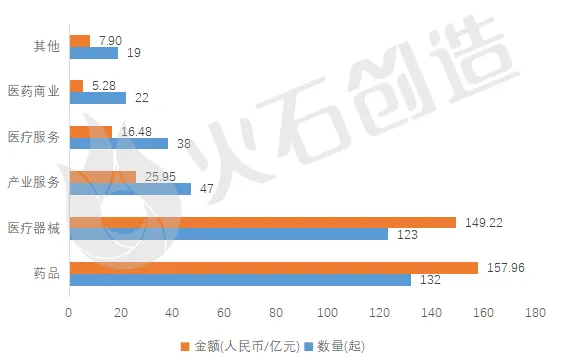 【最受投资人欢迎的领域】上半年药品领域最为吸金,融资金额高达157.96亿元,占总融资金额的43.54%。从项目数量上看,医疗器械领域也较为活跃。