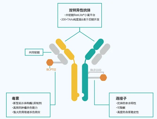 DMO01是一款全人TROP2xEGFR双抗ADC。DM001的共轻链双抗结构是基于百奥赛图RenLite®平台开发得到的,其结构稳定,且纯度较高。DM001使用的Linker-Payload为BLD1102(拓扑异构酶抑制剂类,TOPi)。