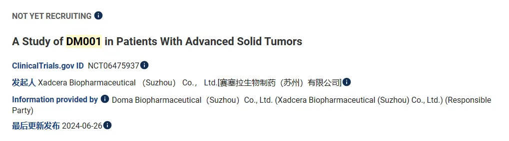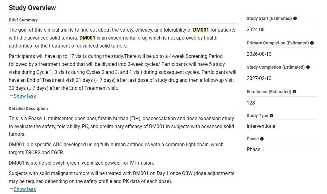 在临床前研究中,DM001展现出强大的抗肿瘤活性和良好的安全性。动物实验结果显示,DM001能够显著抑制多种实体肿瘤的生长,且耐受性良好,未见显著毒性反应。这些积极的数据为其临床研究奠定了坚实基础。据clinicaltrials.gov登记信息,多玛生物即将开展全球临床I期、多中心、开放标签、首次人体剂量递增和扩展研究,将招募乳腺癌、EGFR野生型和突变型非小细胞肺癌、食管癌、胃癌、结直肠癌等多种类型实体瘤患者,旨在探索不同剂量下的DM001在人体中的安全性、耐受性,并初步评估其抗肿瘤活性。