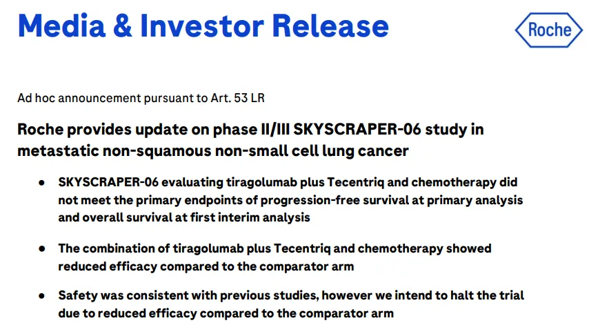 SKYSCRAPER-06 评估 tiragolumab 加 Tecentriq 和化疗的效果,在初步分析时未达到无进展生存期的主要终点,在第一次中期分析时未达到总生存期的主要终点