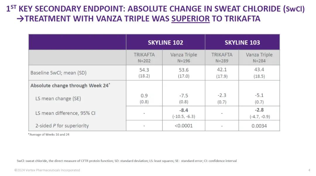 试验结果显示,vanza三联疗法在SKYLINE 102和SKYLINE 103的第一个关键次要终点上,在降低SwCl水平方面表现出优效性。